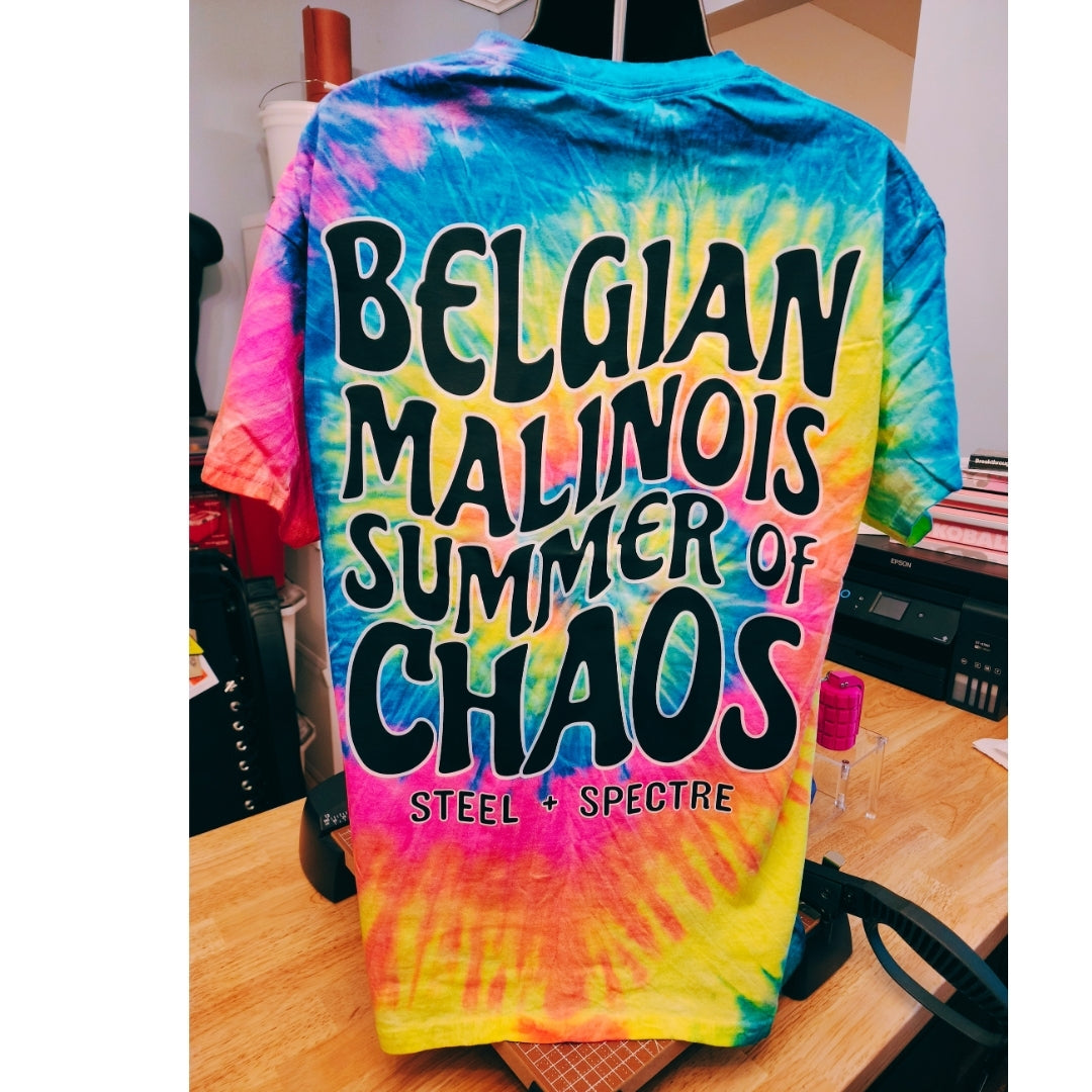 Your Malinois doesn't do calm. They do zoomies at midnight, selective hearing during recall, and full-send everything else. This tee gets it. The Belgian Malinois Summer of Chaos Tie-Dyed Tee is a swirling, fluorescent rainbow explosion that matches the energy of the world's most unhinged working dog — and the humans who love them for it.