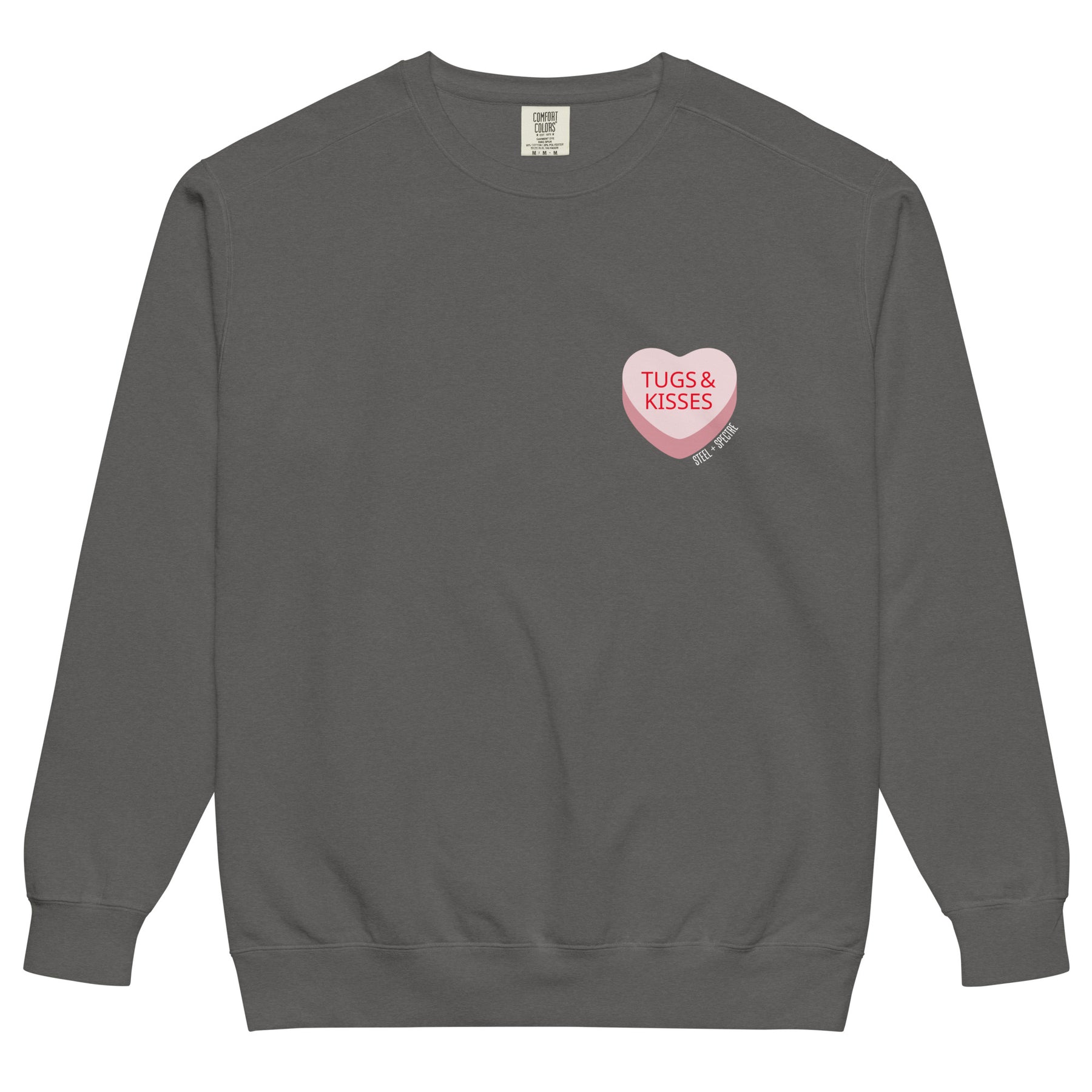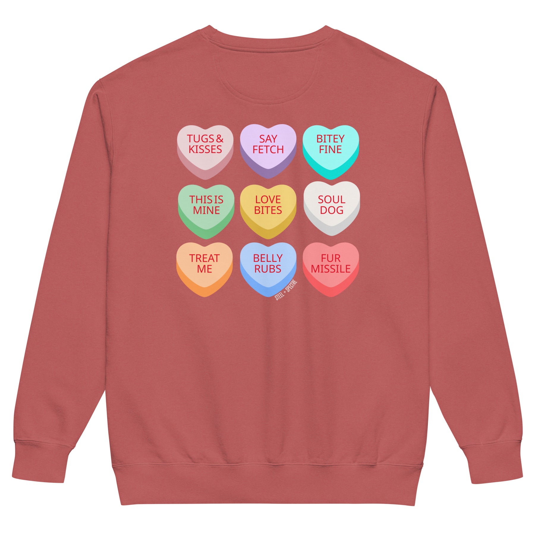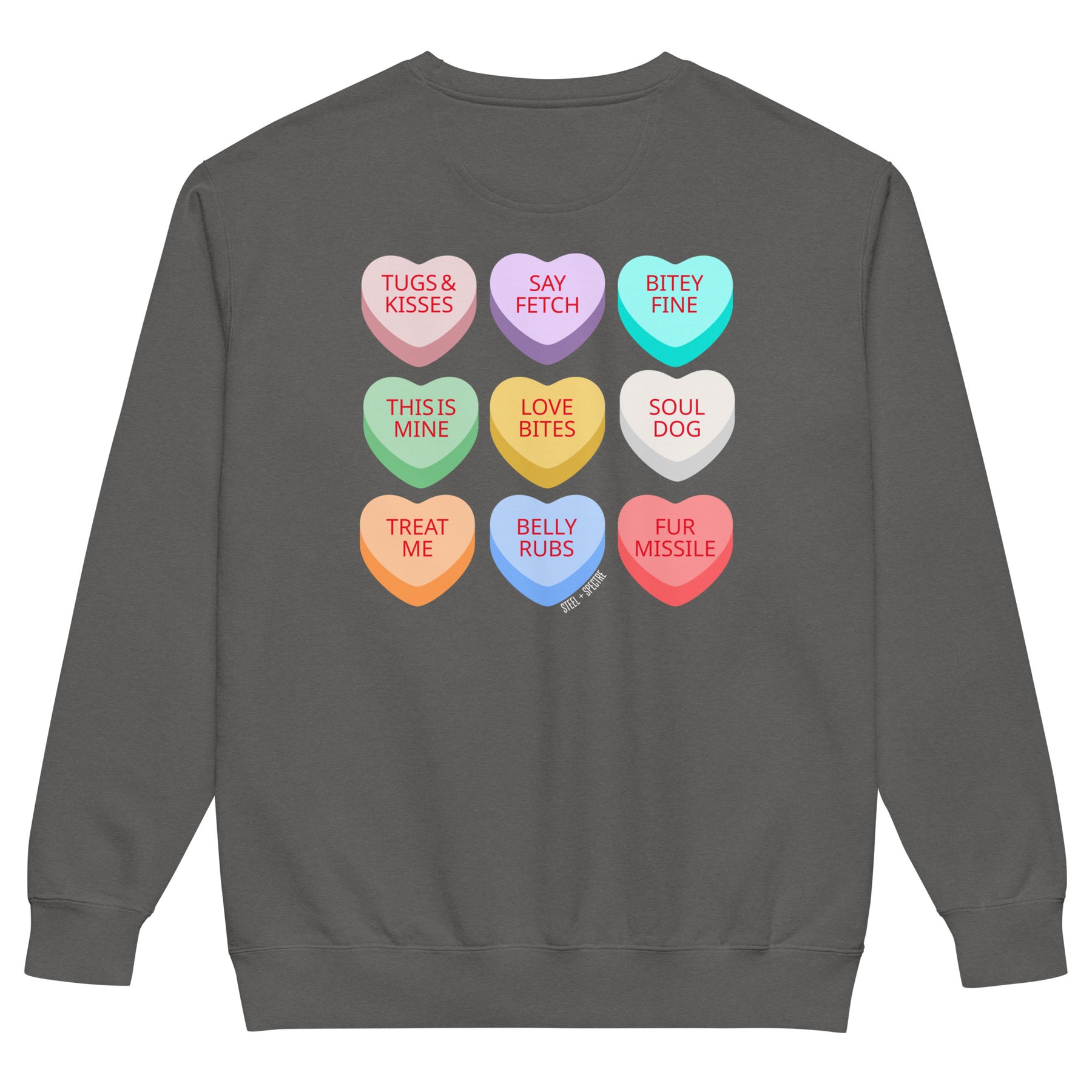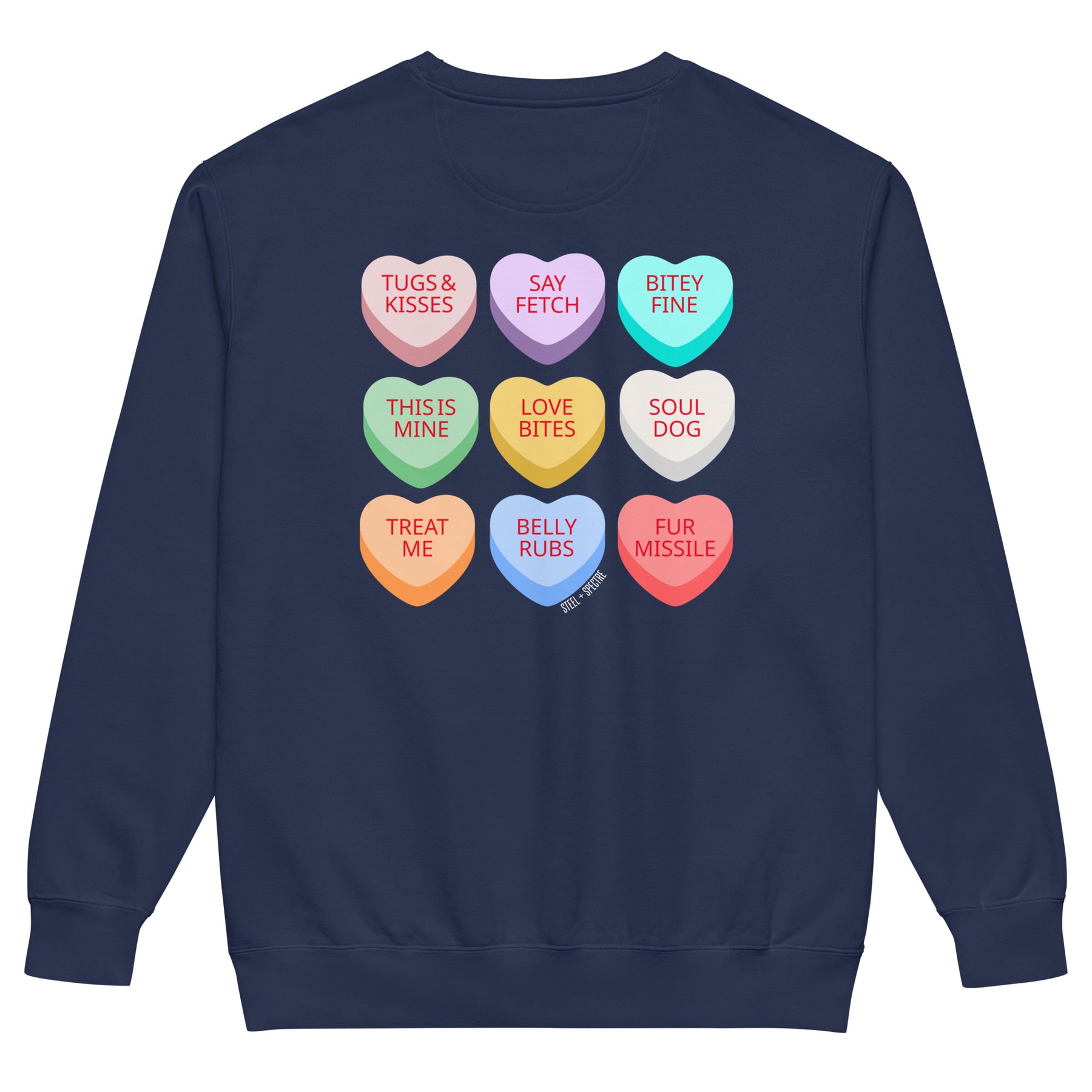 Styled in the likeness of the iconic Valentines Day candy, this design puts a spin on the sweet messages and updates them for the modern dog trainer, handler and enthusiast. With fun sayings like "Tugs & Kisses", "Treat Me" and "Love Bites", this sweatshirt makes a great gift for the dog lover in your life.